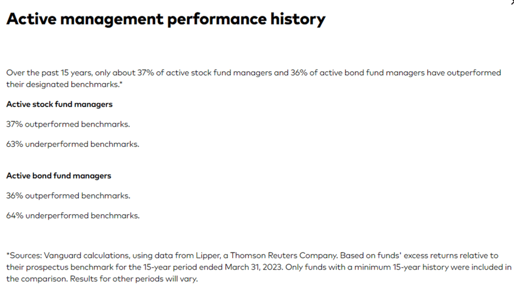 In case some of these words don’t make exact sense, what this previous page on Vanguard is stating is that of all the actively managed funds studied out there, only around 37% of those funds actually beat the index they were trying to beat (that you are paying them extra money to beat). Technically that is better than the pretty much 0% of passively managed funds that beat their benchmark. But again, passively managed funds are not supposed to beat their index benchmarks, they are just supposed to duplicate the index’s performance.